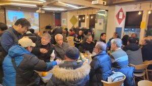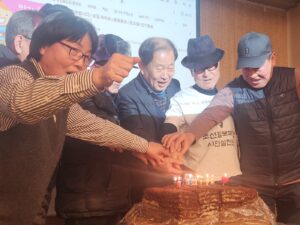 팥시루떡과 야채 비빔밥 그리고 과메기를 안주 삼아 막걸리를 나누는 중에도 성학도인 원용기 조합원의 독창 무대와 조합원들의 담소로 송년회장은 후끈 달아 올랐다. 탄핵정국으로 온 나라가 어수선한 중에도 10년의 역사를 돌아보고 앞으로의 사업을 구상하는 시간을 위해 추운 날씨 마다하지 않고 함께해 주신 조합원 동지들께 감사 드린다.