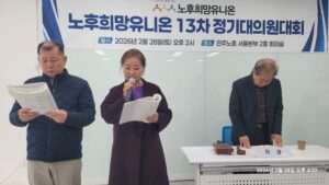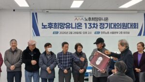 노후희망유니온 13차 정기대의원대회가 지난 2월 28일(토) 오후 3시 대림동 민주노총 서울본부 회의실에서 개최되었다. 이날 김국진 위원장은 대회사에서 2025년 년초 윤석열 파면을 촉구하는 노인시국선언을 필두로 고용보험법 10조2항 삭제를 위한 운동, 무연고 사망 및 자살 노인을 위한 추모 문화제 개최, 조합원 화합의 장인 2025 송년회에서 보여준 빛의 혁명의 주체인 조합원들과 함께 청년의 꿈이 이루어지는 나라, 노후가 행복한 사회를 만들어 가자고 주장했다.